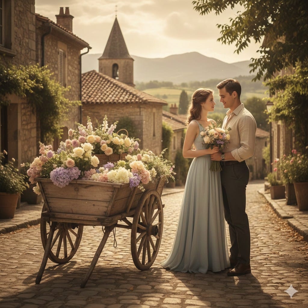 “Full-body portrait of a couple standing near a vintage wooden flower cart in a countryside village. Girl holding flowers, boy looking at her softly. Pastel tones, cobblestone street, warm rural sunlight, cinematic vintage aesthetics, highly detailed 4K romantic portrait.”