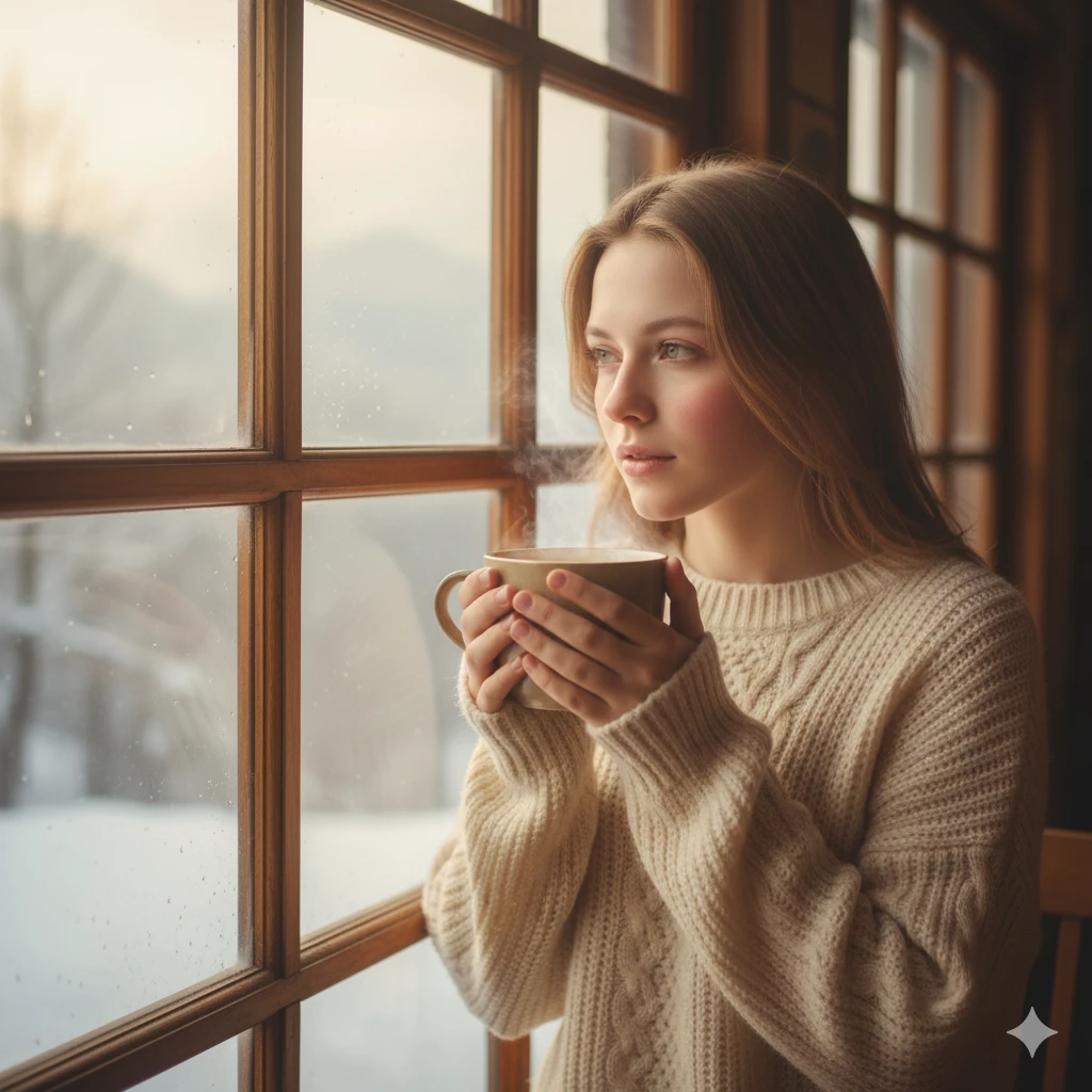 Warm portrait of a 19-year-old girl holding a coffee mug near a hill-station café window, cloudy winter weather outside, knitted sweater, soft indoor lighting.
