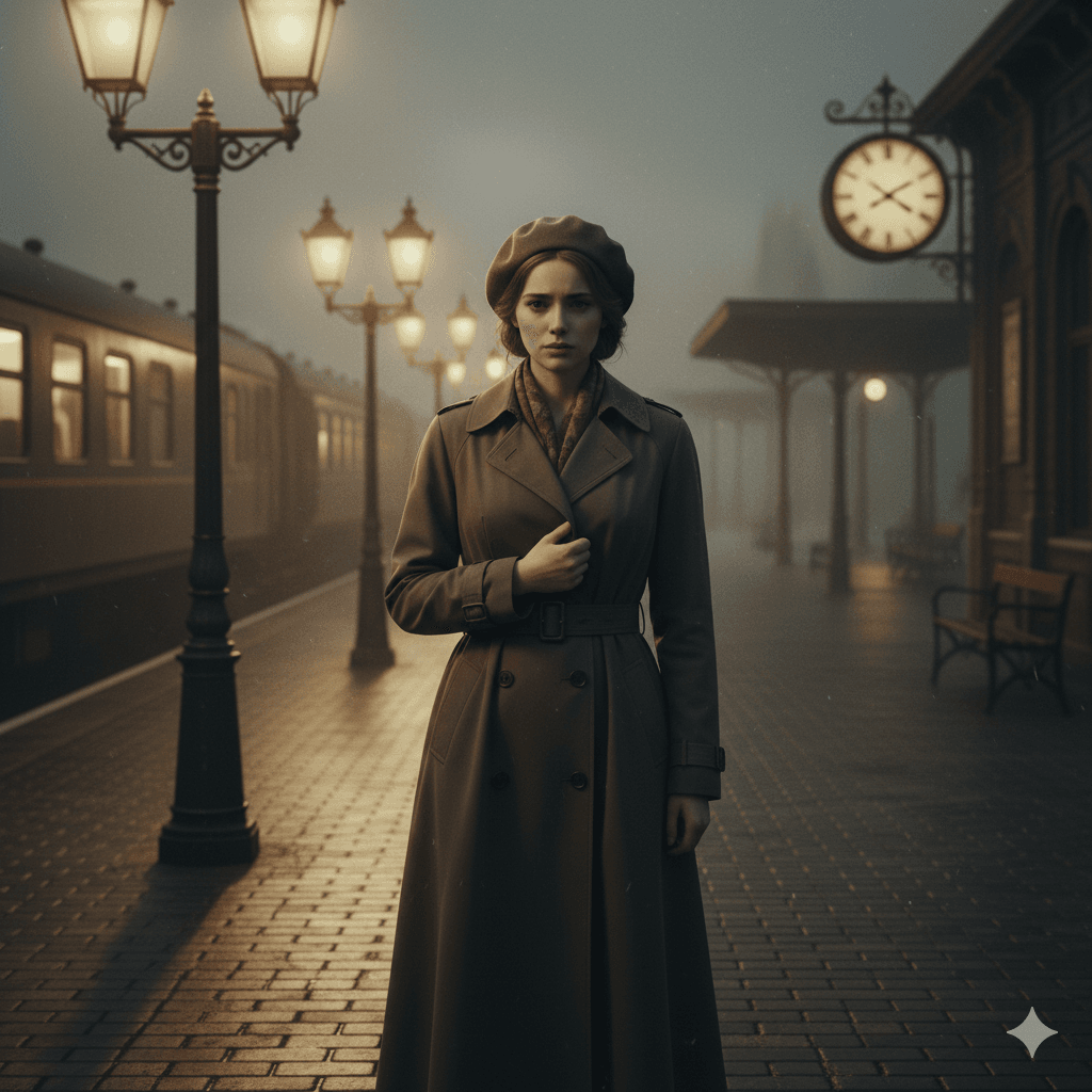 A girl standing at a vintage train station, muted film colors, soft grain texture, emotional expression, classic retro cinematic feel, timeless aesthetic.