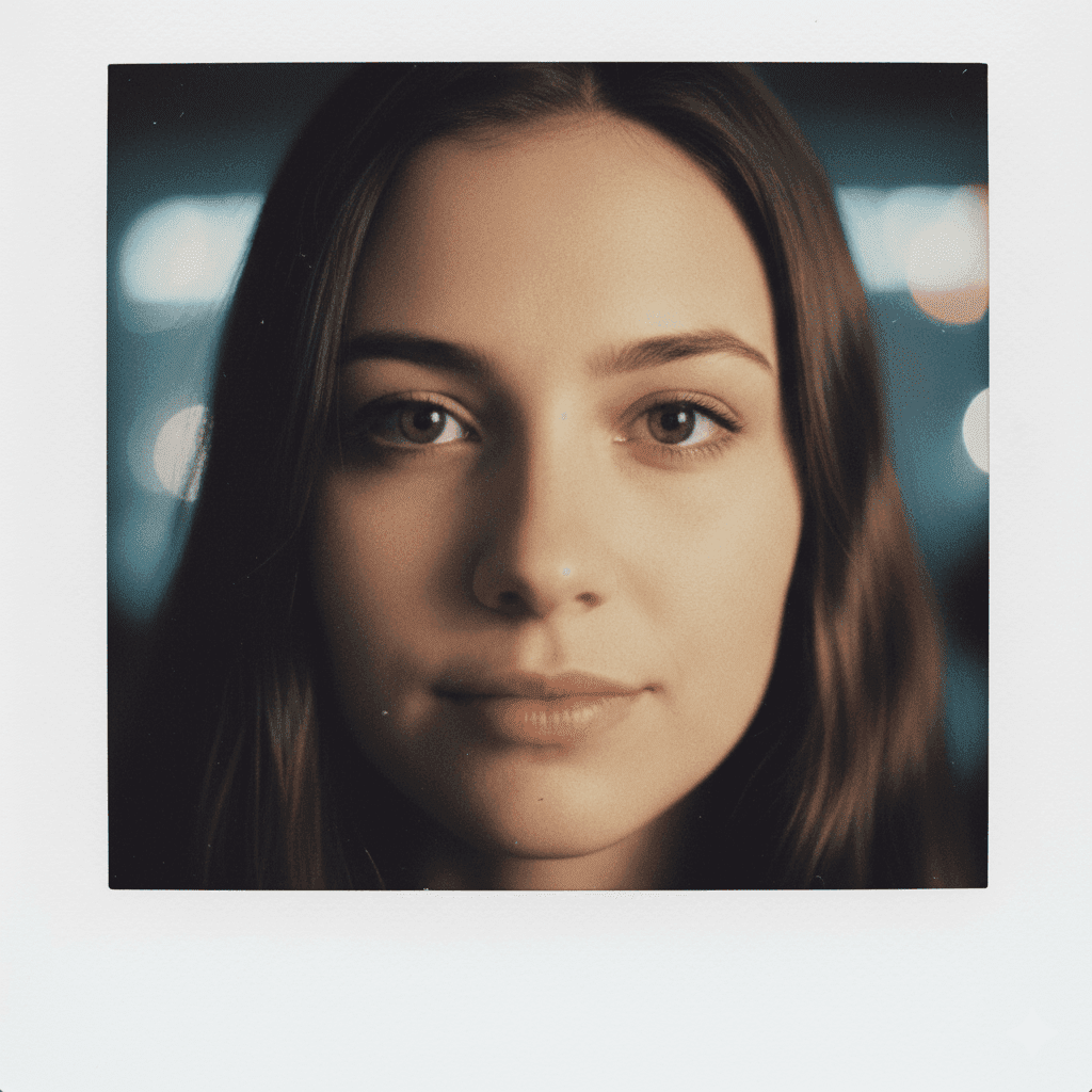 A close-up Polaroid-style portrait, pastel lighting, soft-focus edges, warm nostalgic highlights, natural expression, classic 1990s retro film aesthetic.