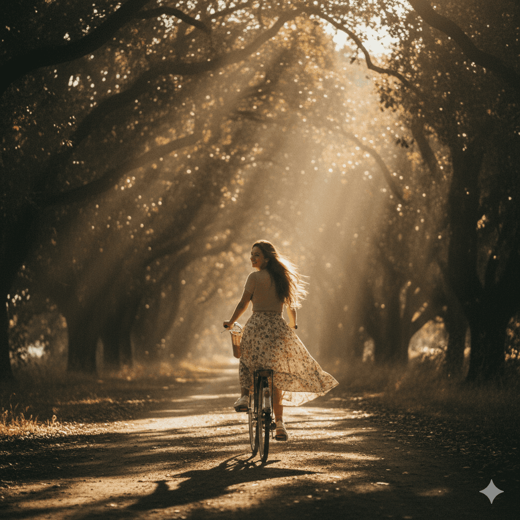 A girl riding a vintage bicycle along a tree-lined lane, golden sunlight filtering through leaves, flowing skirt motion, rustic retro aesthetic, cinematic wide-angle.