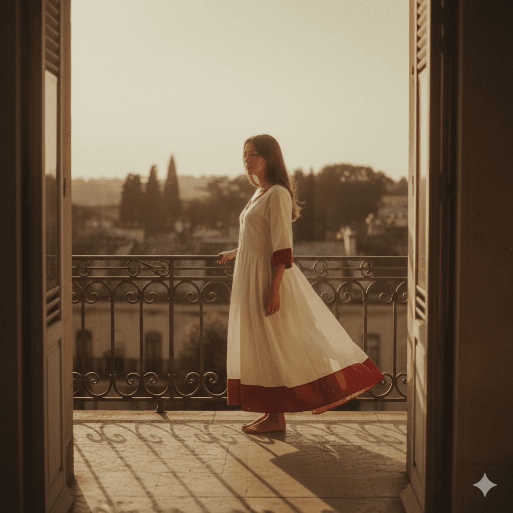 A young woman in a white cotton dress with a red border, standing on a balcony during golden hour, soft sunlight creating dramatic shadows, visible film grain, poetic vintage look, cinematic 4K detail.