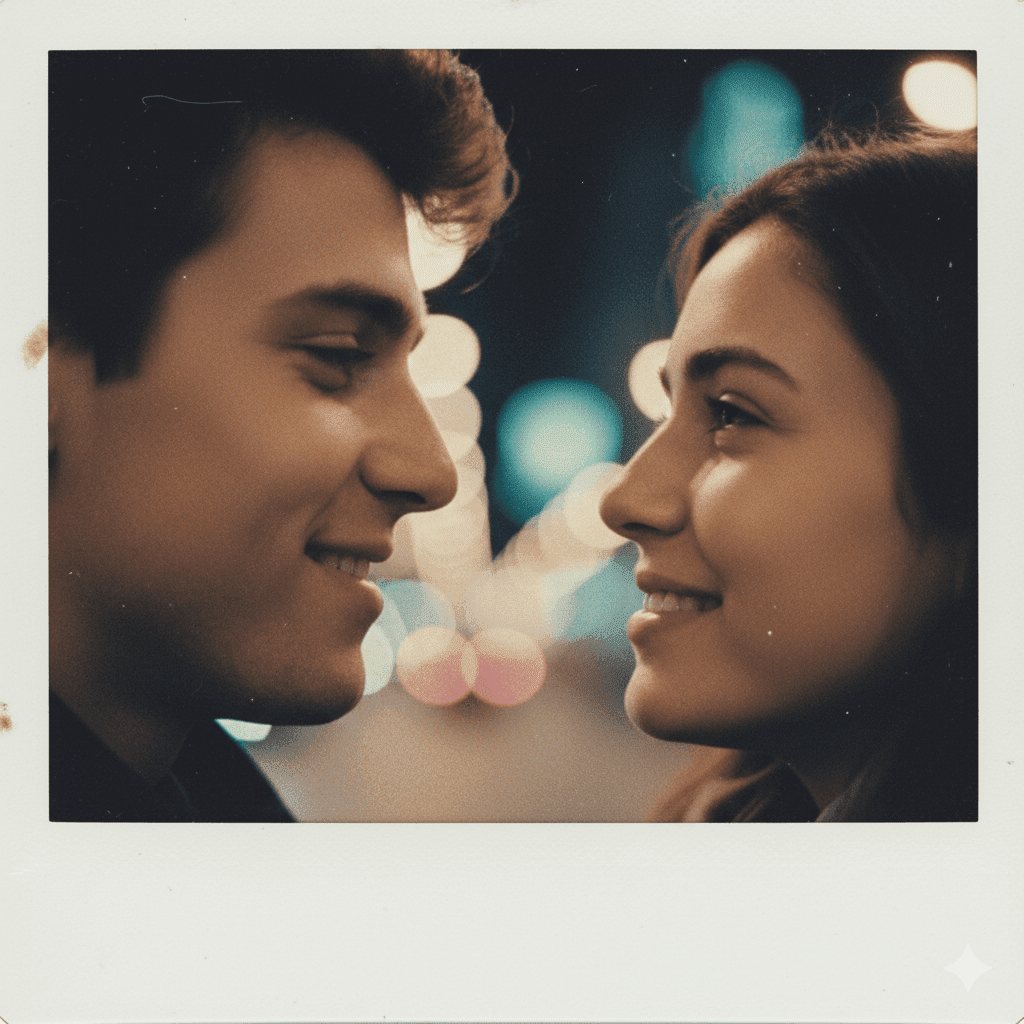 A close-up retro Polaroid-style portrait of a couple, pastel lighting, soft-focus edges, warm nostalgic tone, natural expressions, 1990s film aesthetic.