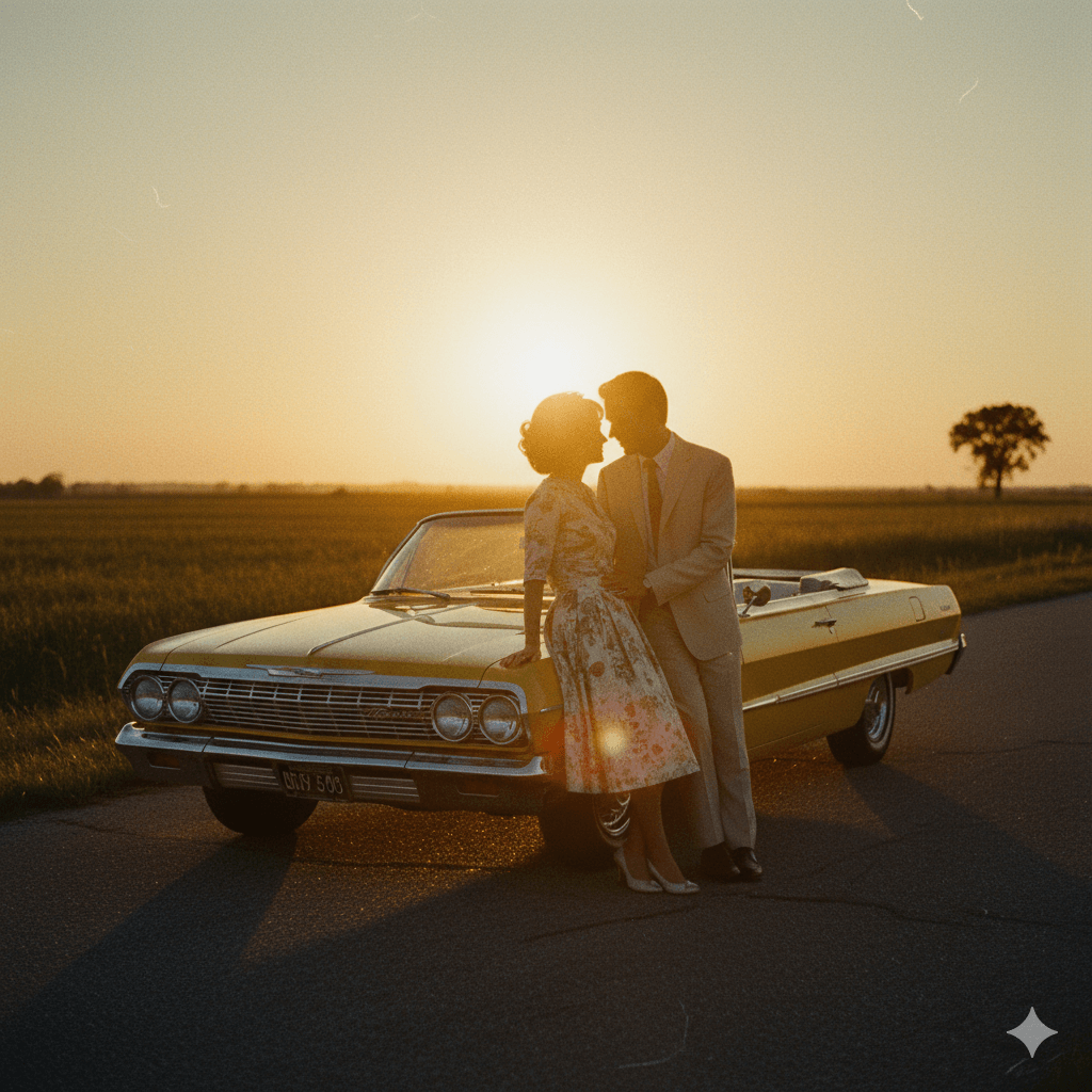 A couple leaning against a vintage 1960s car at sunset, golden film tones, detailed grain texture, soft shadows, nostalgic romantic pose, cinematic retro mood.