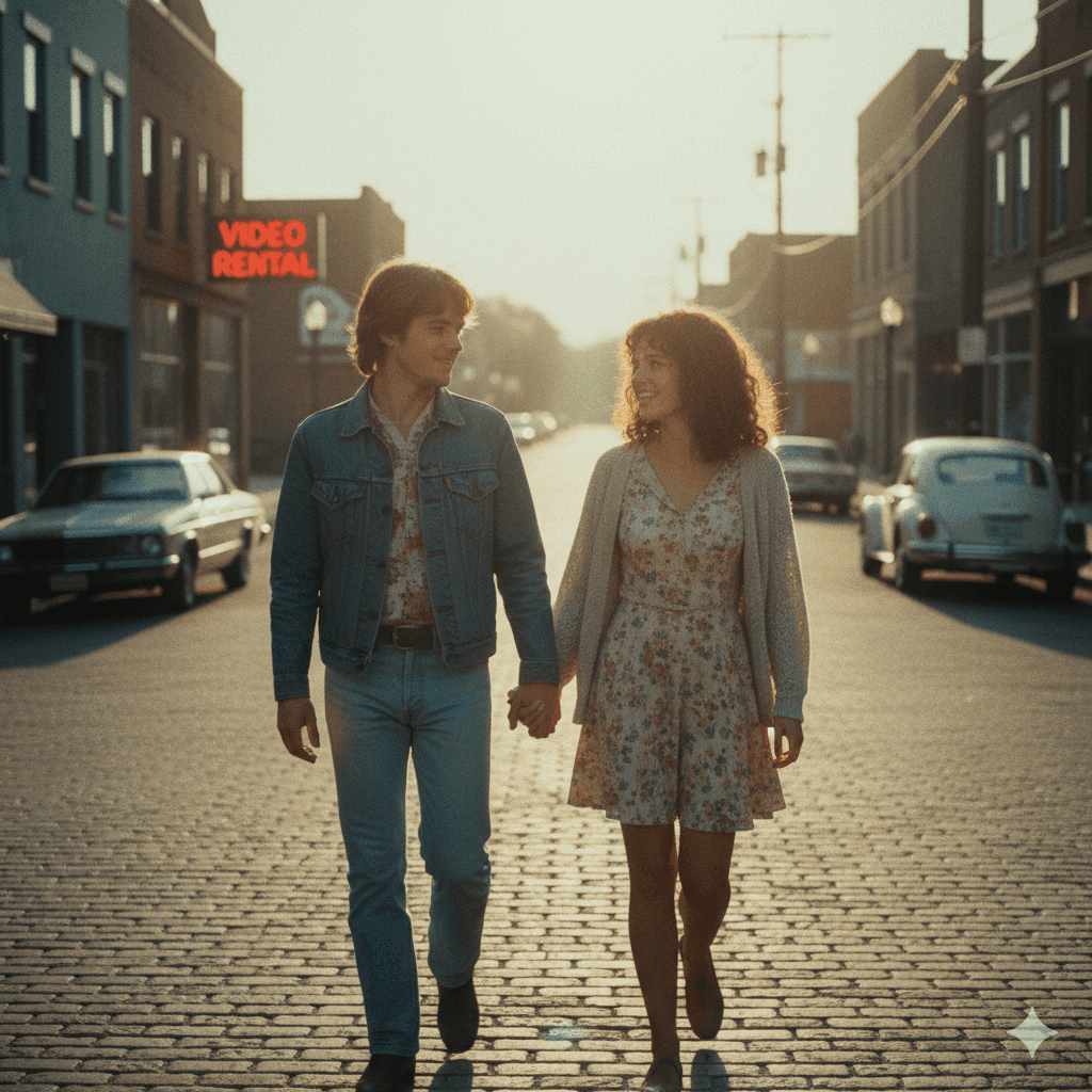 A couple walking on a quiet 1980s-style street, muted retro colors, soft film grain, warm sunlight glow, slow-motion cinematic feel, authentic vintage vibe.