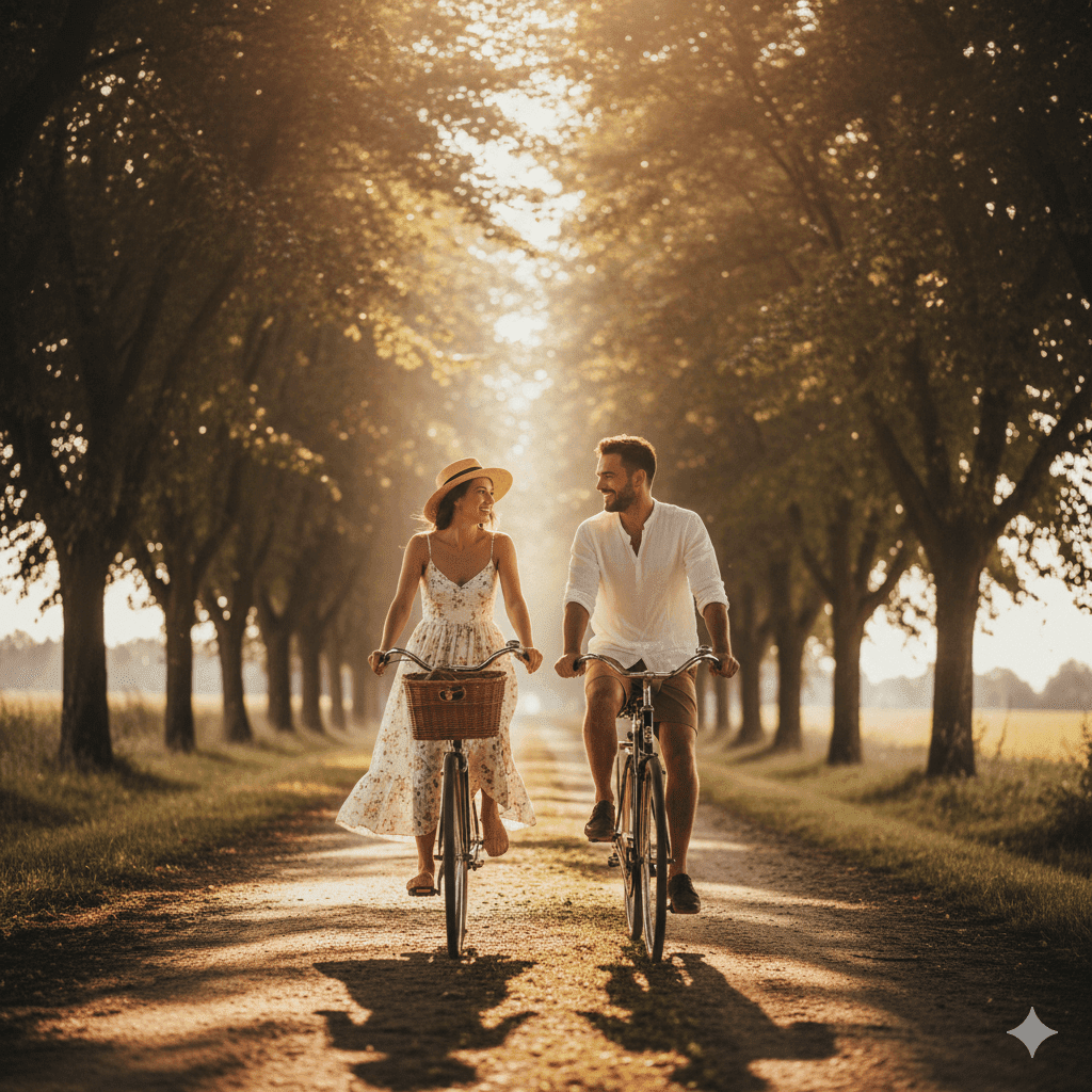 A couple riding vintage bicycles on a tree-lined country lane, golden sunlight filtering through leaves, dynamic joyful motion, rustic retro aesthetic, cinematic wide-angle.