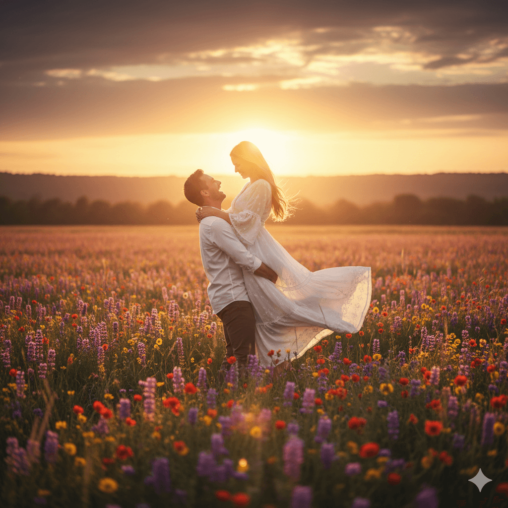 A man lifting a woman in a meadow filled with wildflowers at sunset, flowing dress motion, dreamy warm aesthetic, golden-hour glow, cinematic romantic composition.