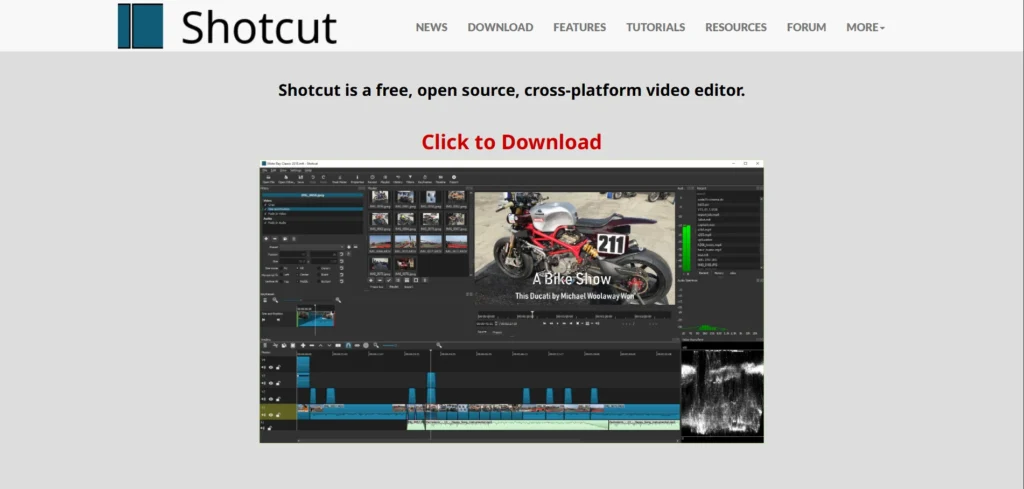 Shotcut is a 100% free and open-source video editor. This means it is built by a community of developers and will always be free. It is a reliable and trustworthy tool for basic to intermediate editing.