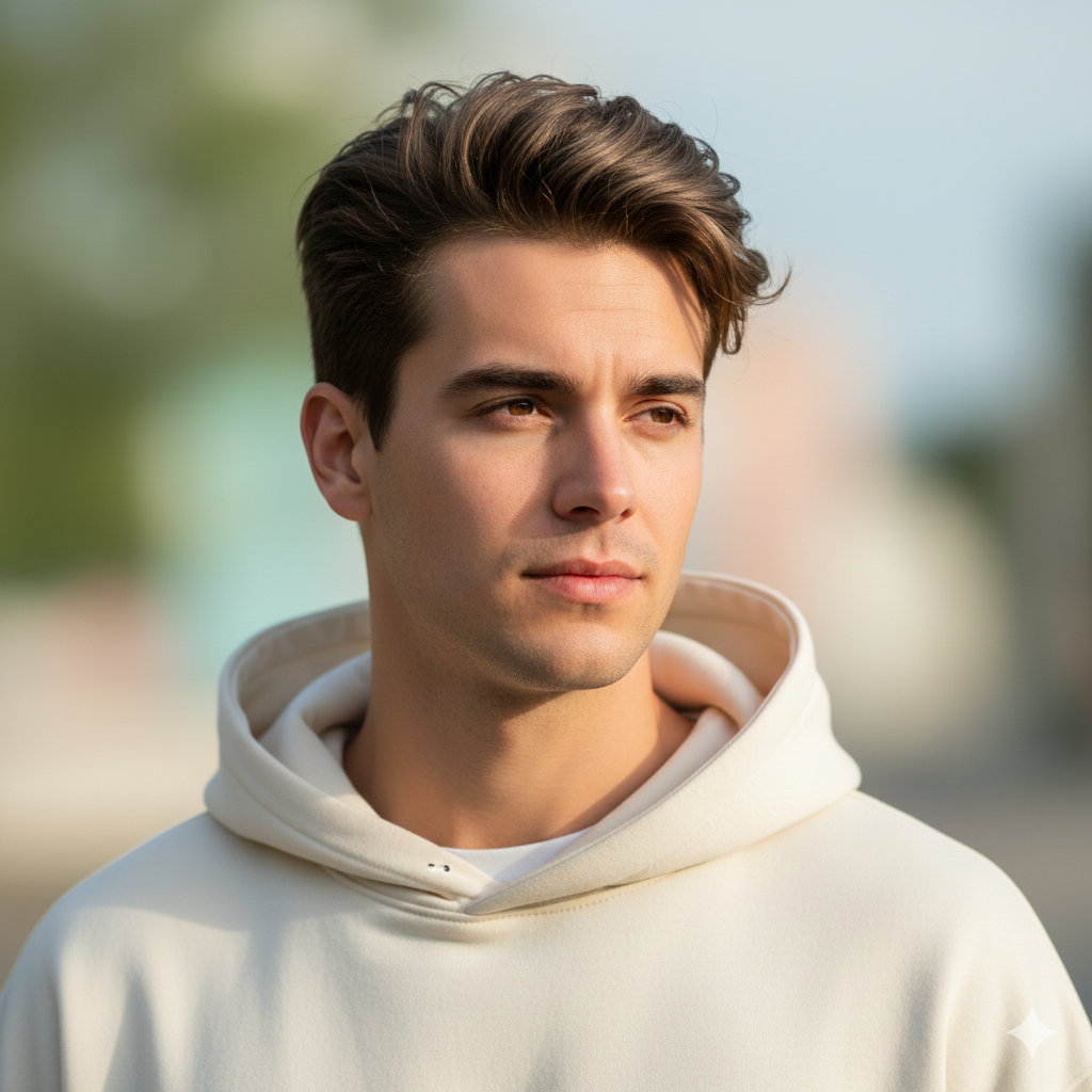 A trendy boy in a casual oversized hoodie, natural soft daylight, subtle wind in the hair, relaxed expression, pastel background blur, smooth matte tones, crisp detail on eyes, soft shadow aesthetics, ultra-realistic portrait perfect for Instagram.