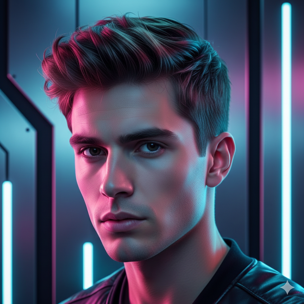 A boy with stylish hair, subtle neon reflections, futuristic cyber lighting, clean metallic background, sharp jawline, high-definition detail, smooth color gradients, sci-fi inspired portrait photography.
