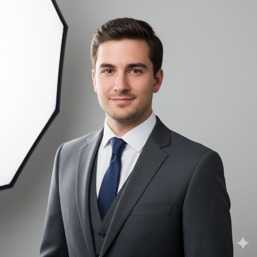 A professional young man in a tailored suit, clean neutral background, confident but friendly expression, studio softbox lighting, polished high-end corporate photography style, sharp focus on eyes, premium business portrait.