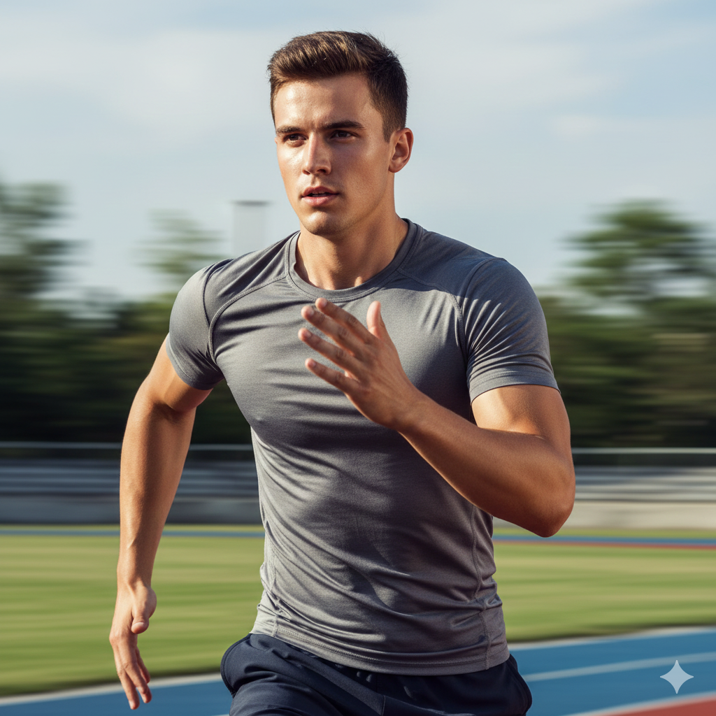 A fit young man in athletic wear, defined muscles, energetic pose, outdoor natural lighting, crisp highlights on skin, sporty aesthetic, dynamic background blur, ultra-sharp HD portrait with realistic textures.