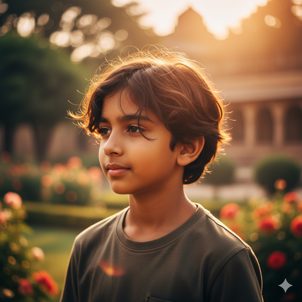 A boy standing in warm golden-hour sunlight, soft orange reflections in hair, glowing skin tone, gentle wind, dreamy blurred background, natural outdoor bokeh, warm cinematic color palette, photorealistic portrait.