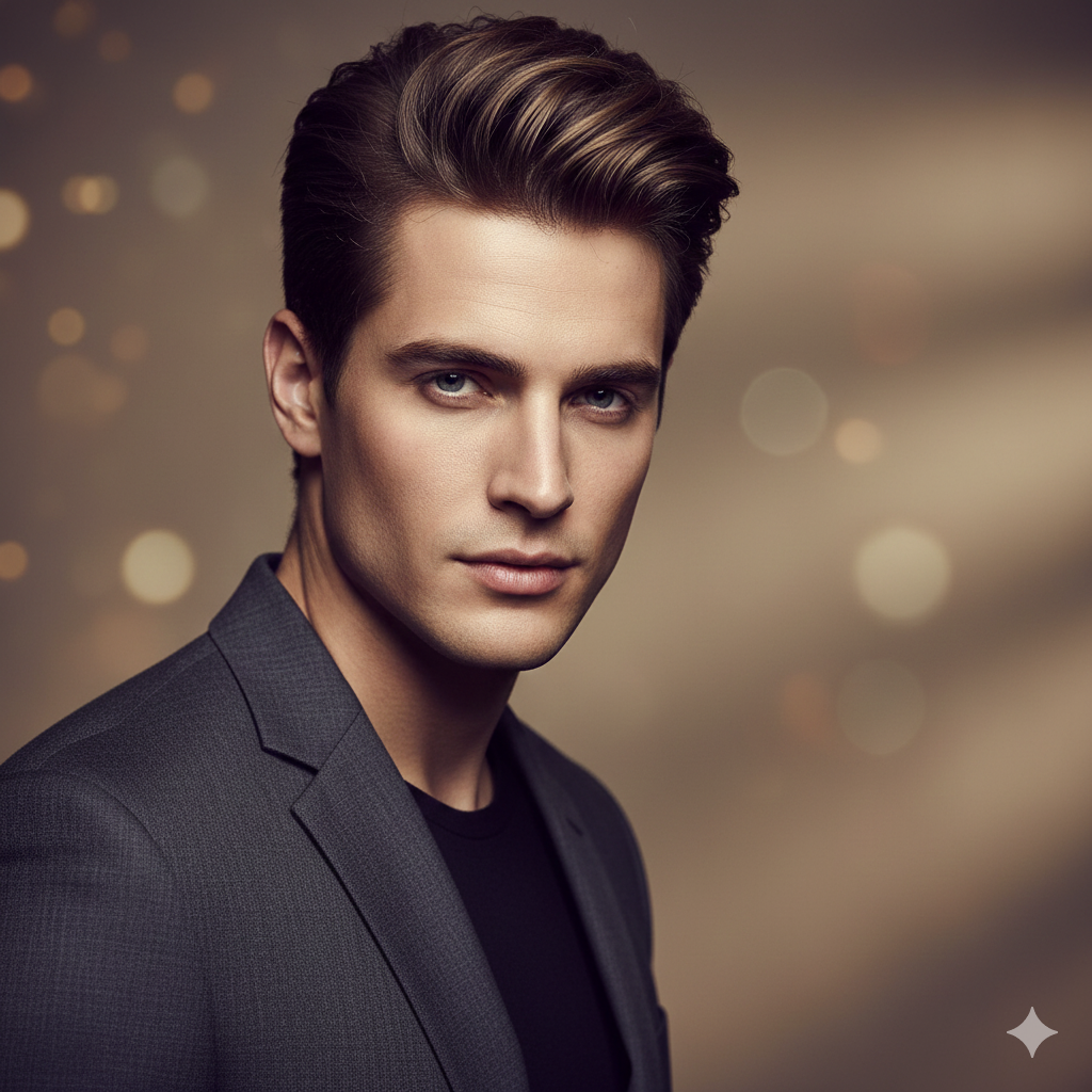 A handsome young man with sharp facial features, styled hair, and a confident expression, wearing a fitted modern jacket, soft cinematic key lighting, minimal background, ultra-HD clarity, fashion-editorial photography, natural skin texture, bokeh depth, premium portrait shot.