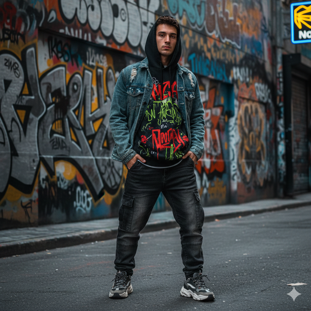 A cool boy in streetwear fashion, graffiti wall background, bold city colors, clean facial highlights, crisp HDR detail, stylish pose with hands in pockets, natural ambient lighting, modern urban aesthetic, ultra-HD portrait with sharp edges.
