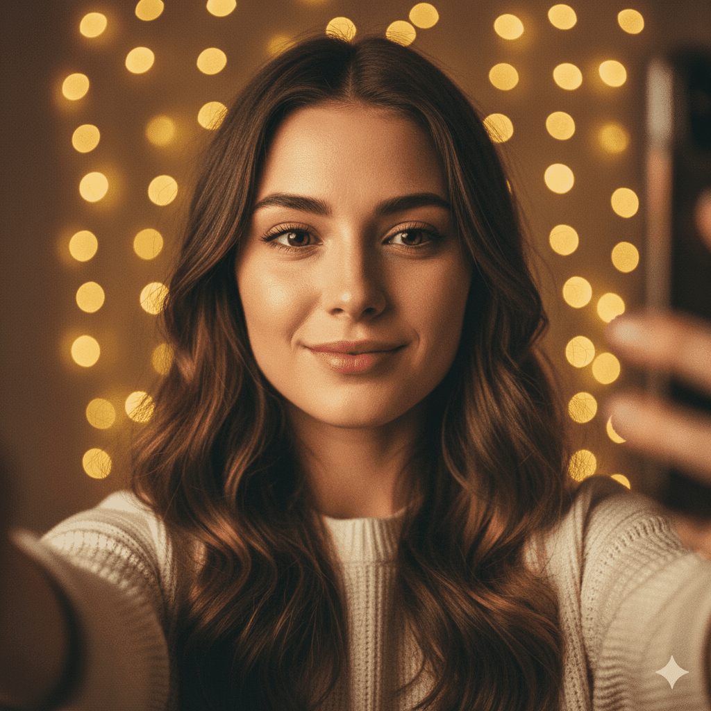 Prompt: Girl taking a selfie near warm fairy lights, soft bokeh background, warm golden glow on skin, cozy dreamy indoor aesthetic, ultra-realistic 4K.