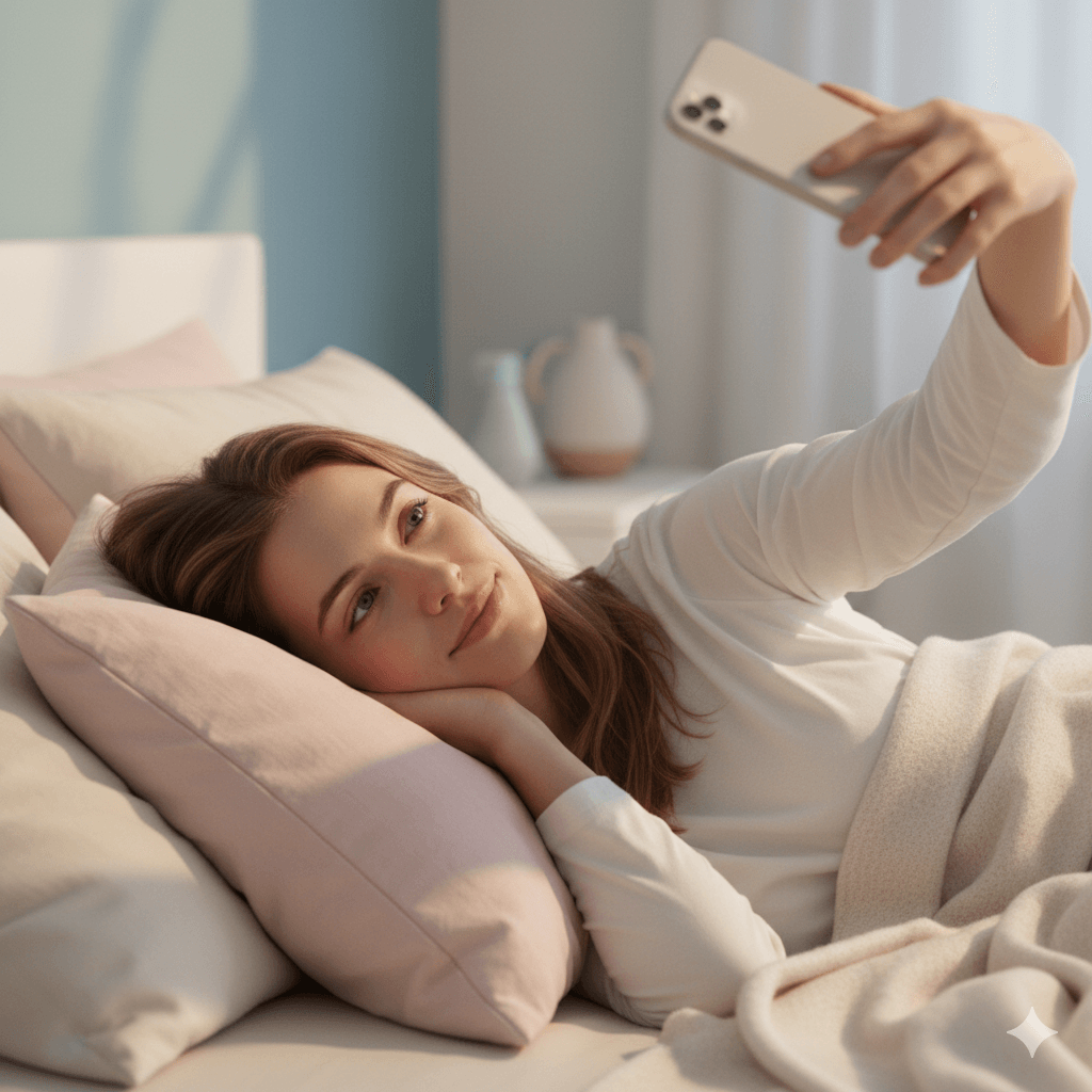 Prompt: Girl taking selfie on bed or near soft pillows, warm natural light, soft pastel décor, relaxed expression, dreamy soft 4K portrait.