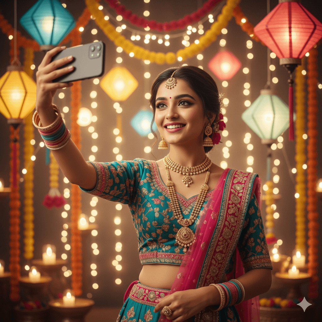 Prompt: Girl taking selfie during festive celebration, colorful outfit, warm lighting, joyful expression, cinematic Indian aesthetic, 4K selfie.