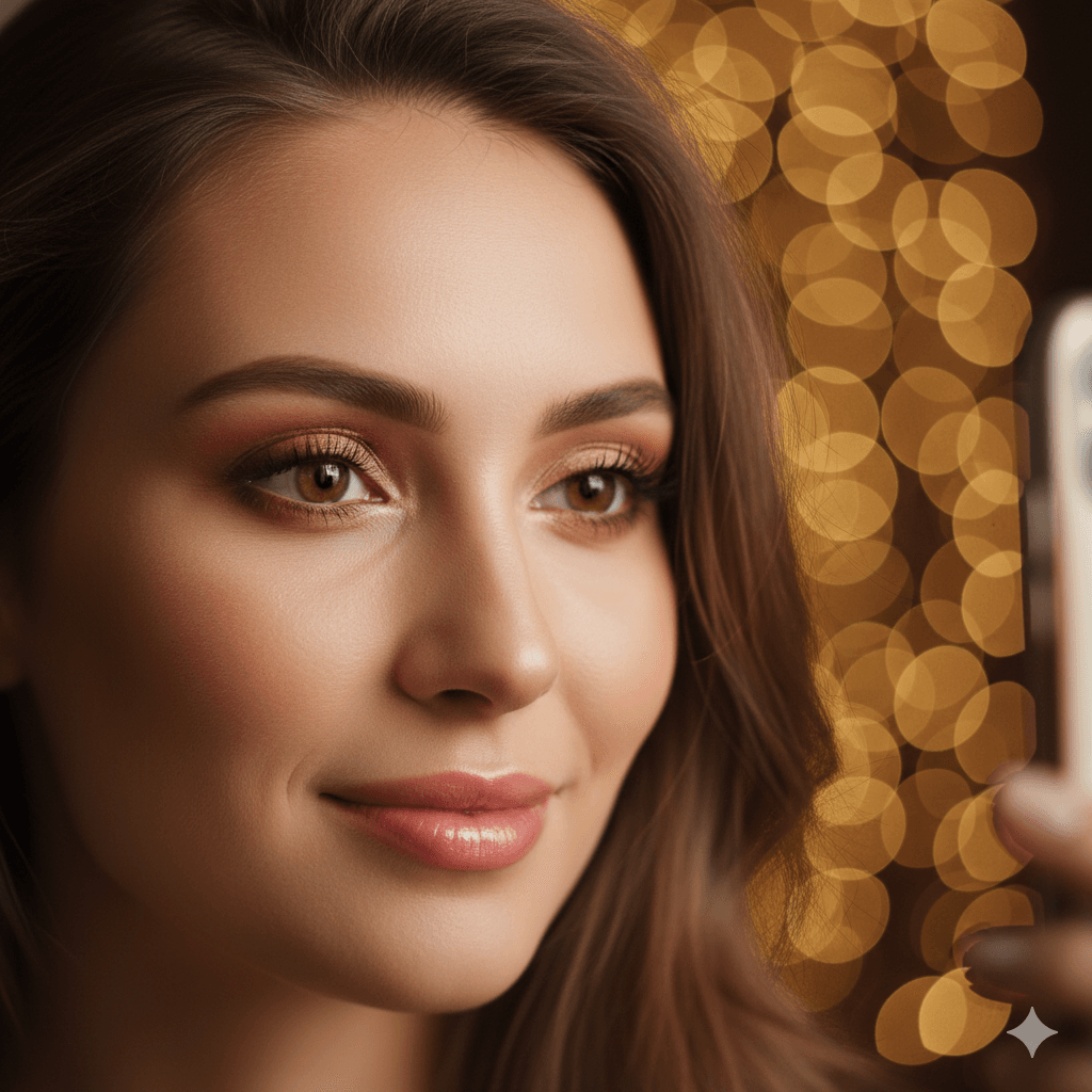 Prompt: Close-up selfie highlighting makeup, soft soft-focus background, warm lighting, gentle expression, cinematic 4K ultra-realistic portrait.