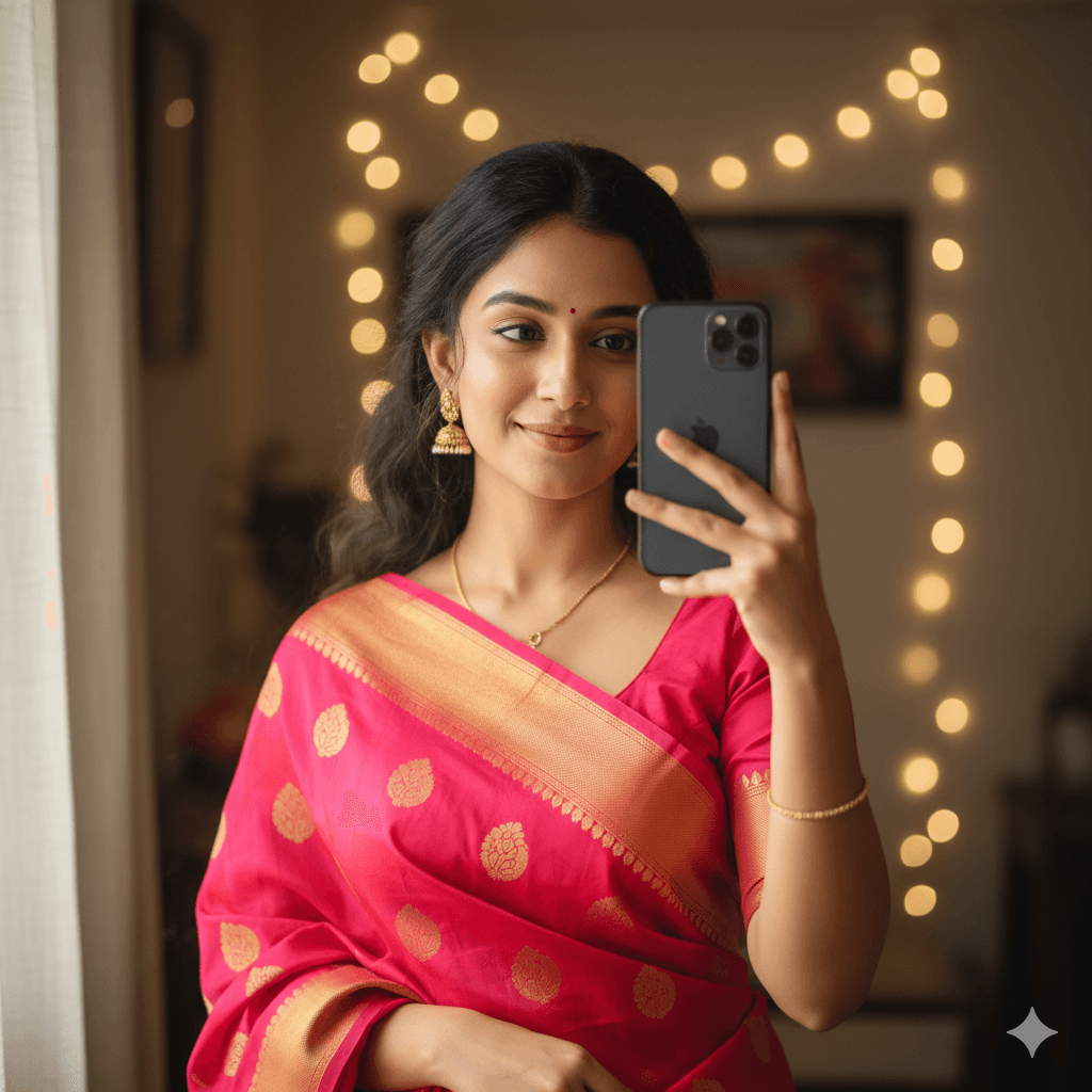 Prompt: Indian girl taking a selfie wearing a vibrant saree or kurti, soft warm lighting, subtle jewelry, gentle shadows, authentic Indian aesthetic, 4K selfie.