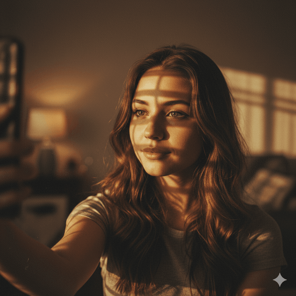 Prompt: Girl taking a selfie in soft morning light, neutral outfit, minimal background, gentle warm tones, soft cinematic 4K portrait.
