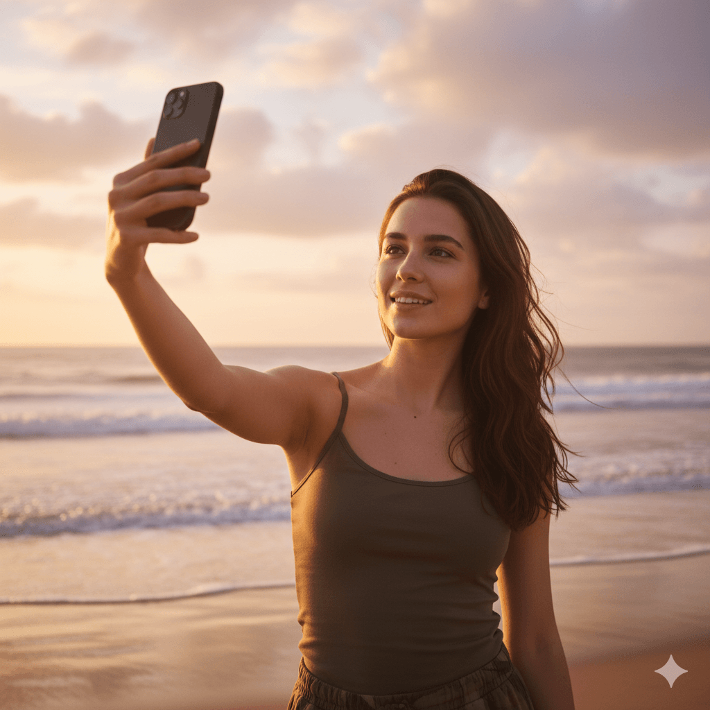 Prompt: Girl taking a selfie on beach during golden hour, soft wind in hair, pastel sunset sky, warm soft glow on face, dreamy cinematic aesthetic, 4K selfie.