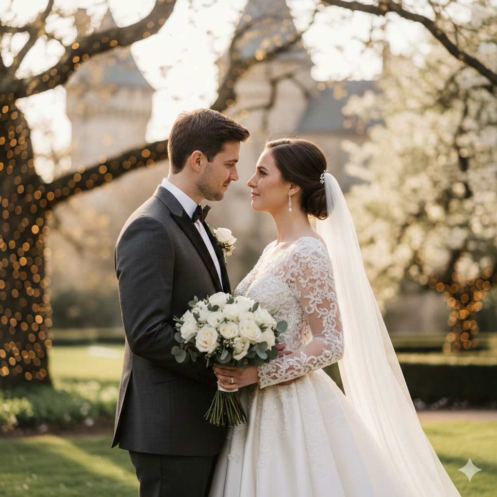 Full body bride and groom standing close, emotional eye contact, elegant wedding outfits, soft glowing lighting, cinematic romantic atmosphere, ultra realistic skin and fabric detail, professional wedding photography style.