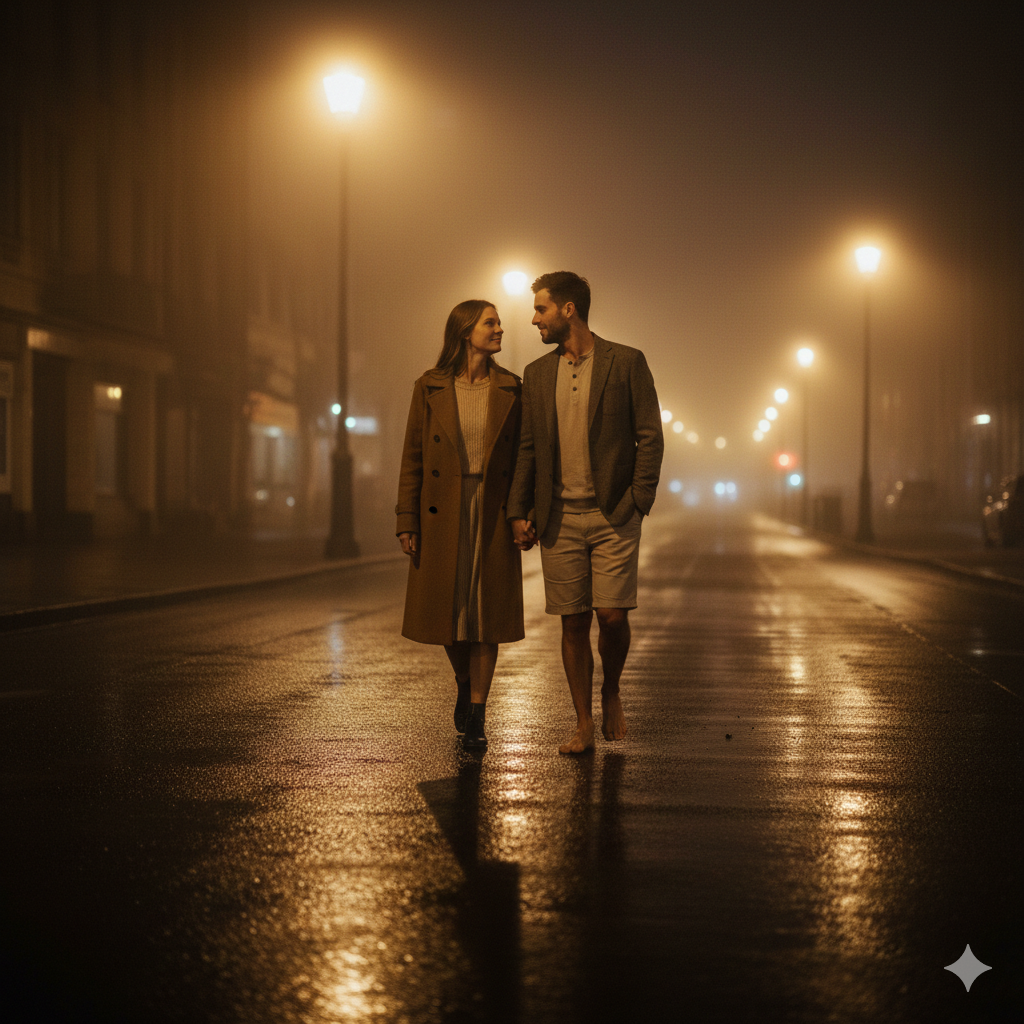 Full body couple walking under glowing street lights at night, soft fog atmosphere, cinematic moody lighting, romantic close interaction, ultra realistic reflections on road.