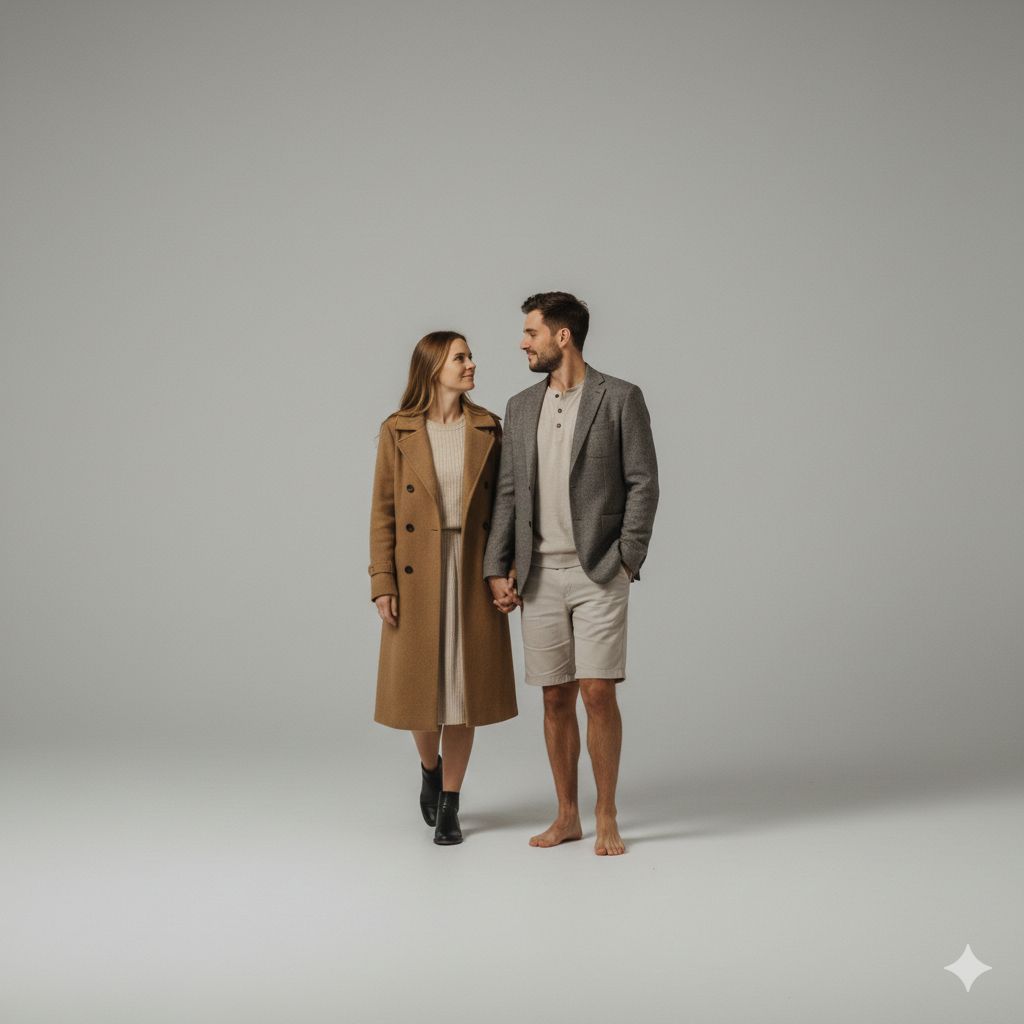 Full body couple standing close in clean studio background, soft diffused professional lighting, natural emotional expressions, ultra sharp realistic portrait photography.
