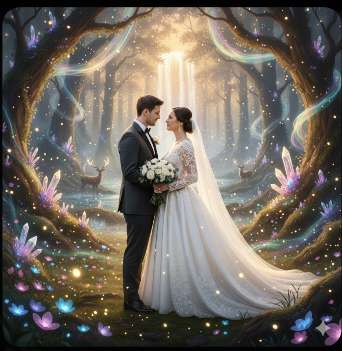 Full body couple standing in glowing dreamy landscape, magical soft lighting, emotional romantic expression, ultra realistic fantasy environment.