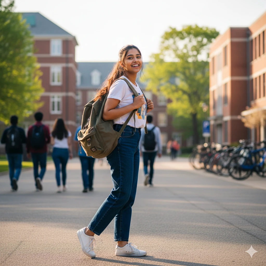 “Cute Indian college girl with backpack, candid smile, campus background, soft morning sunlight, casual outfit aesthetic, vibrant color grading, realistic portrait shot.”