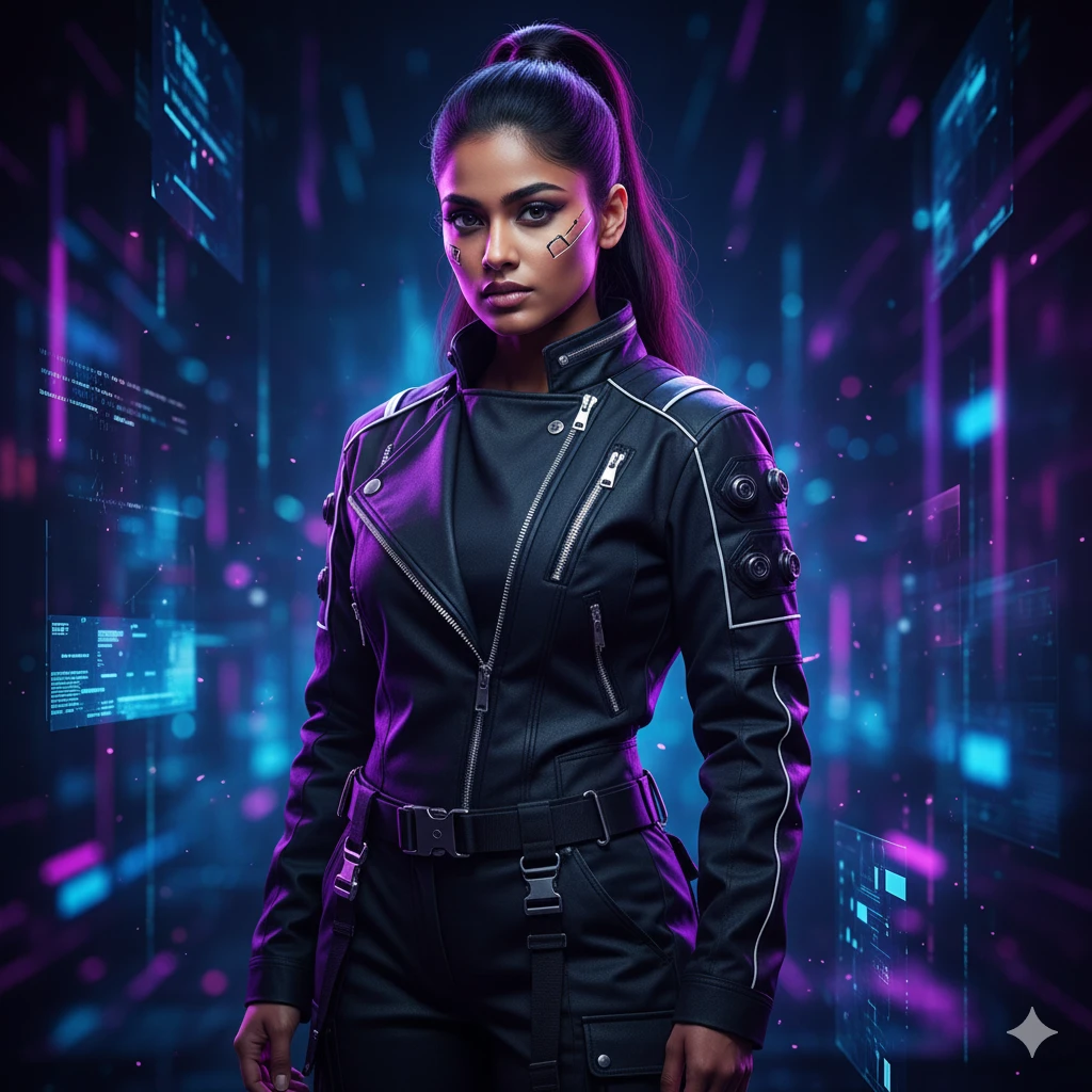 “Indian girl in modern techwear outfit, purple-blue neon rim light, futuristic digital background, high-fashion cyber portrait, ultra-detailed face.”