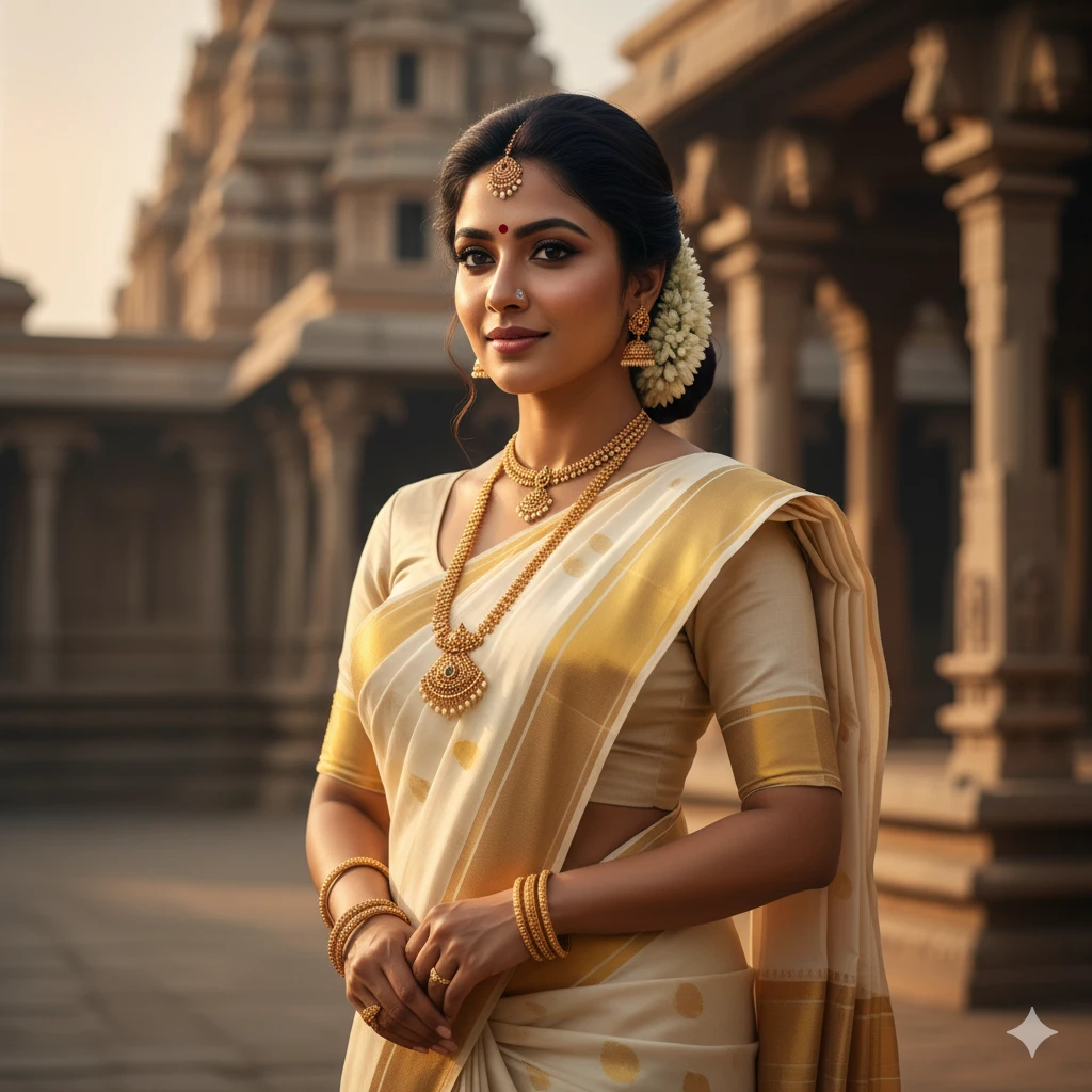 “South Indian girl in kasavu saree, temple background, jasmine flowers in hair, gold jewelry, warm tones, cultural beauty portrait, extremely detailed 4K shot.”