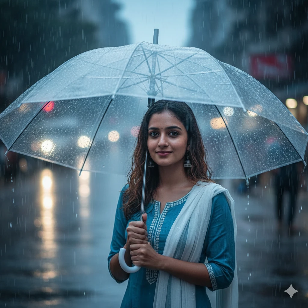 “Indian girl holding transparent umbrella, monsoon drizzle, wet street reflections, soft blue tones, gentle smile, cinematic rain aesthetic, HD portrait.”
