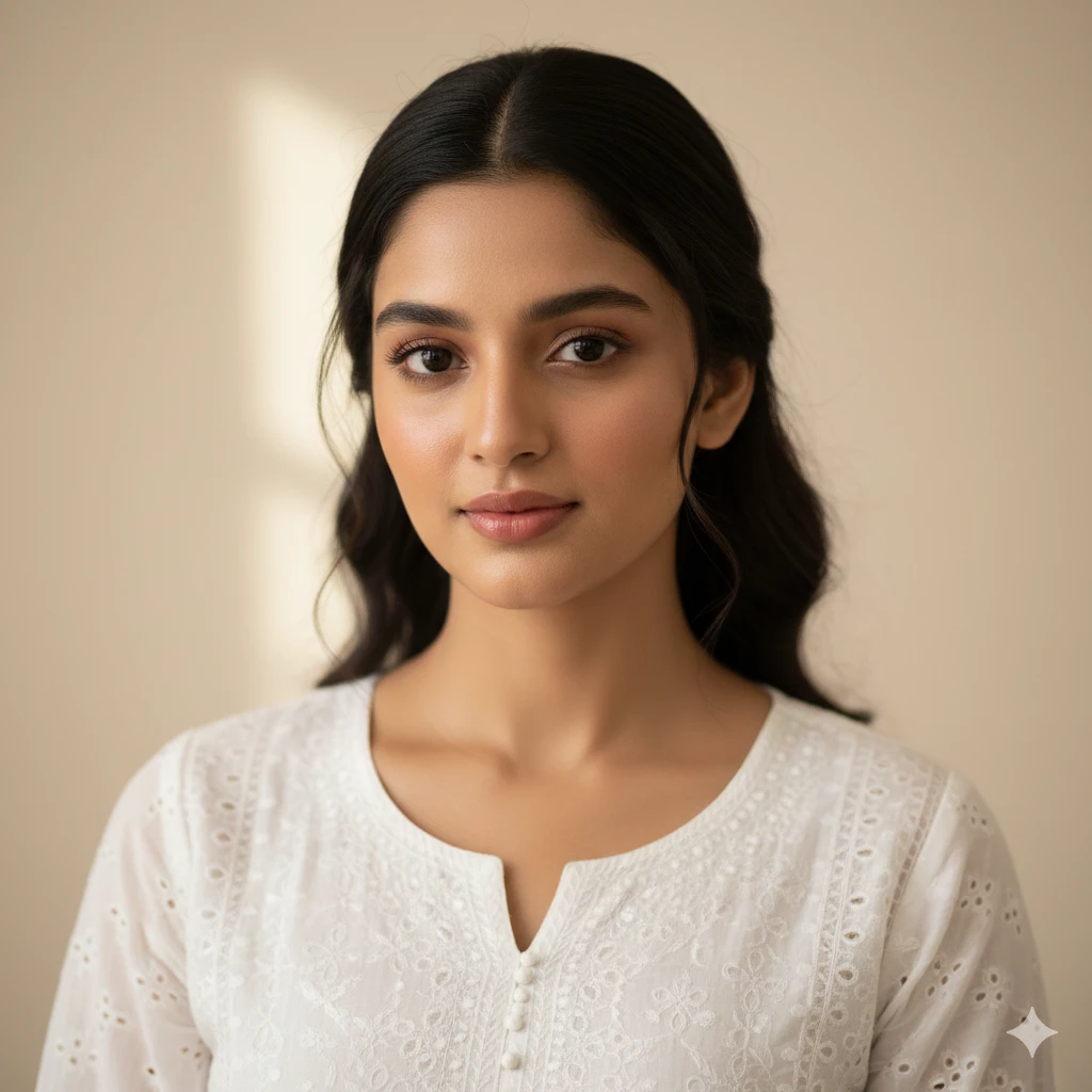 “Indian girl with minimal makeup, clean glowing skin, white chikankari kurti, soft studio light, natural beauty emphasis, smooth tones, ultra-realistic clean portrait.”