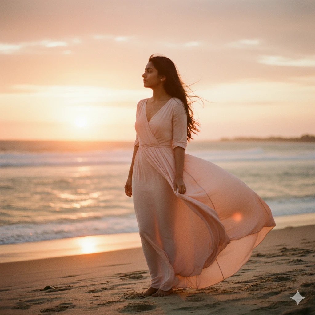 “Indian girl at beach during sunset, peach & orange sky, flowy dress, wind blowing hair, romantic mood, soft film-style portrait.”