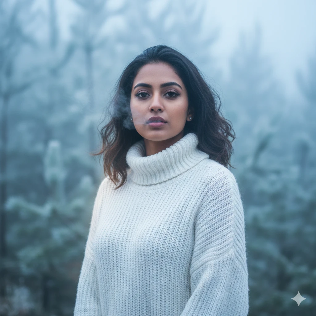 “Beautiful Indian girl in white knitted sweater, light morning fog, pine trees behind, soft winter breath effect, glossy eyes, romantic mood, ultra-realistic 4K winter portrait.”