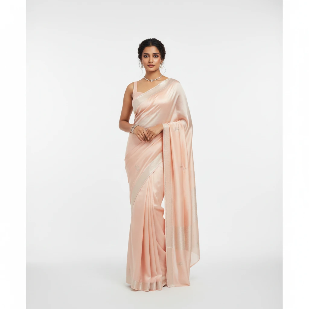 “Indian girl wearing silk saree in pastel peach shade, clean white studio, soft diffused lighting, elegant pose, silver jewelry, natural makeup look, high-fashion editorial style.”