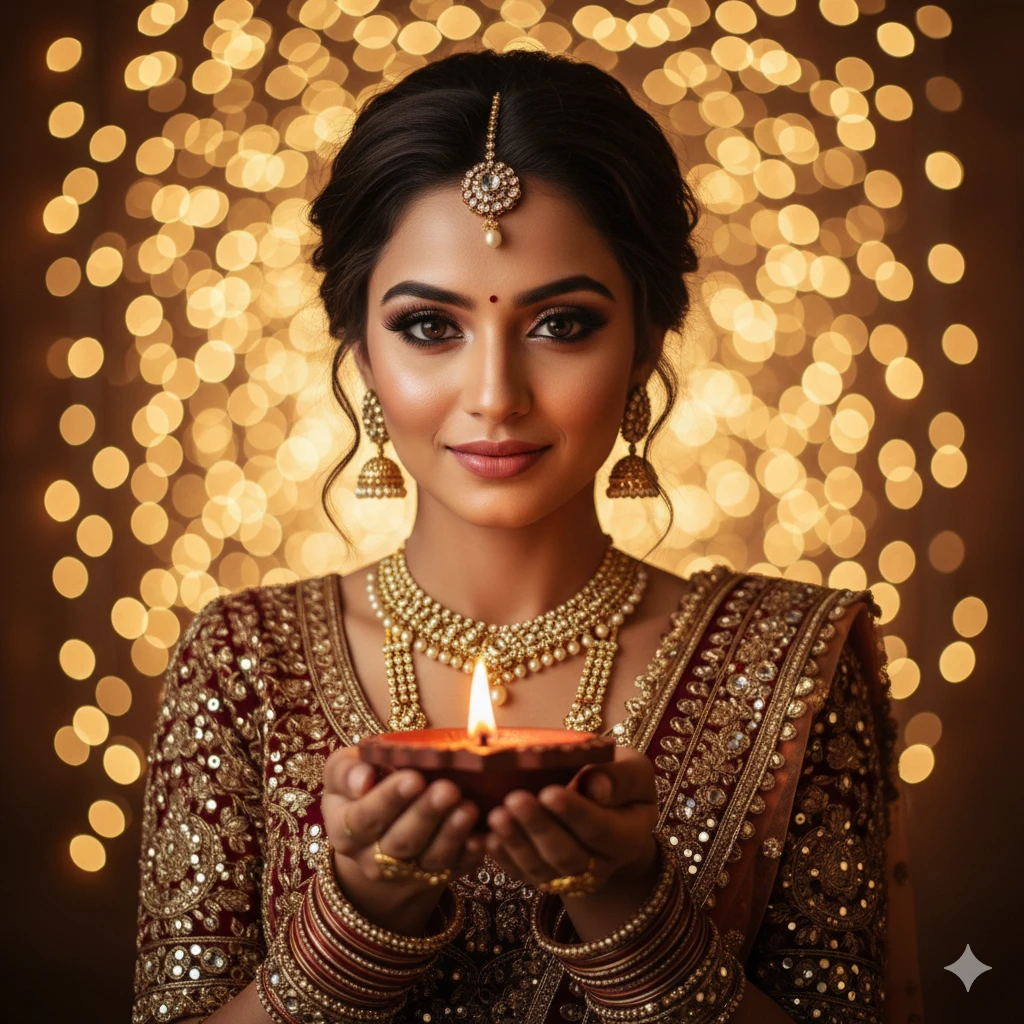 “Indian girl holding diya, warm golden lights bokeh, traditional Indian lehenga, festive glowing face, glamorous eyes, cinematic festival portrait, 8K detailing.”