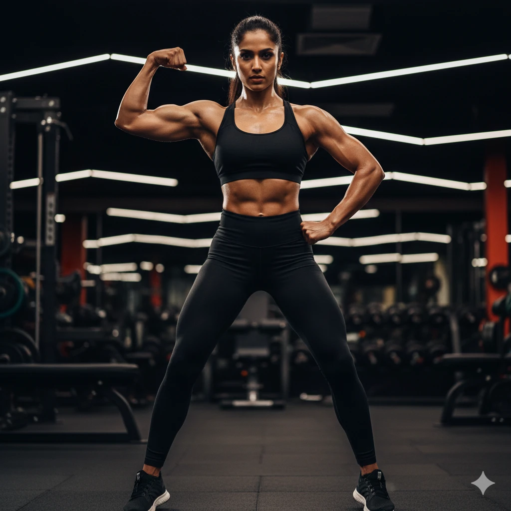 “Indian girl in black sports outfit, gym background blurred, shiny sweat glow, strong confident pose, high contrast lighting, fitness model portrait 4K.”