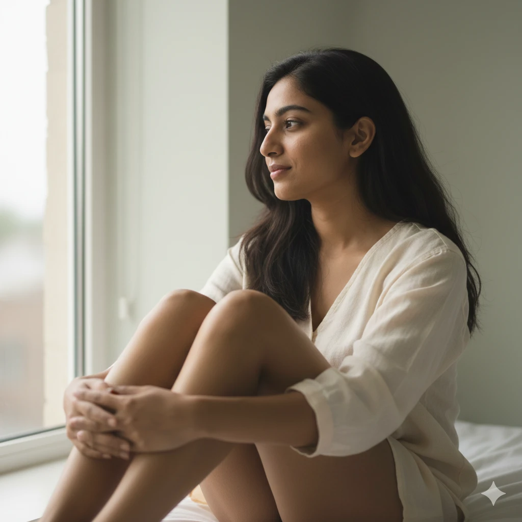 “Indian girl sitting on bed near window, soft natural indoor light, plain pastel background, relaxed pose, realistic skin texture, minimal aesthetic portrait.”