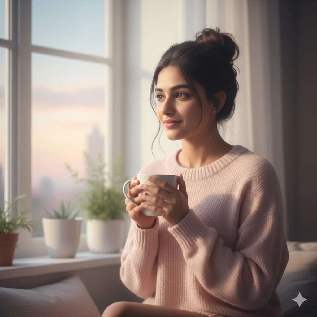“Indian girl sitting near window holding tea cup, calm early morning vibe, pastel colors, messy bun hairstyle, cozy sunlight, natural soft aesthetic.”