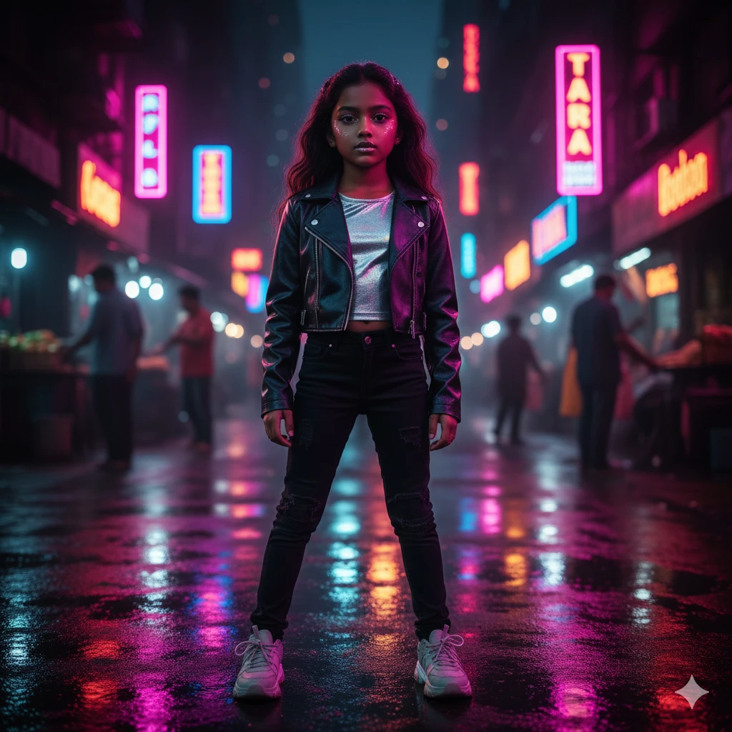 “Indian girl standing under neon pink & purple lights, Mumbai nightlife aesthetic, glossy skin reflection, urban fashion look, cinematic cyber-glow style, ultra-sharp 4K portrait.”