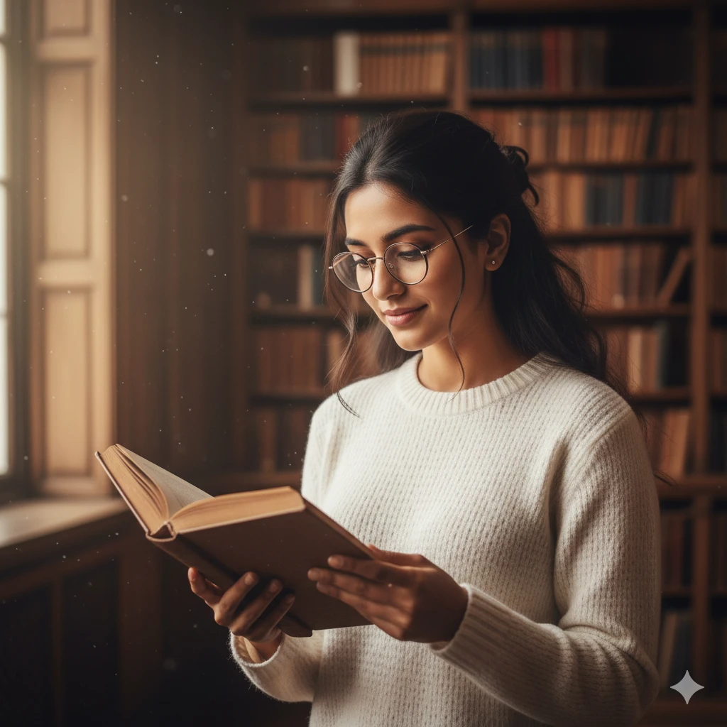 “Indian girl reading book inside library, soft ambient lights, warm brown tones, glasses aesthetic, peaceful intellectual look, HD portrait.”