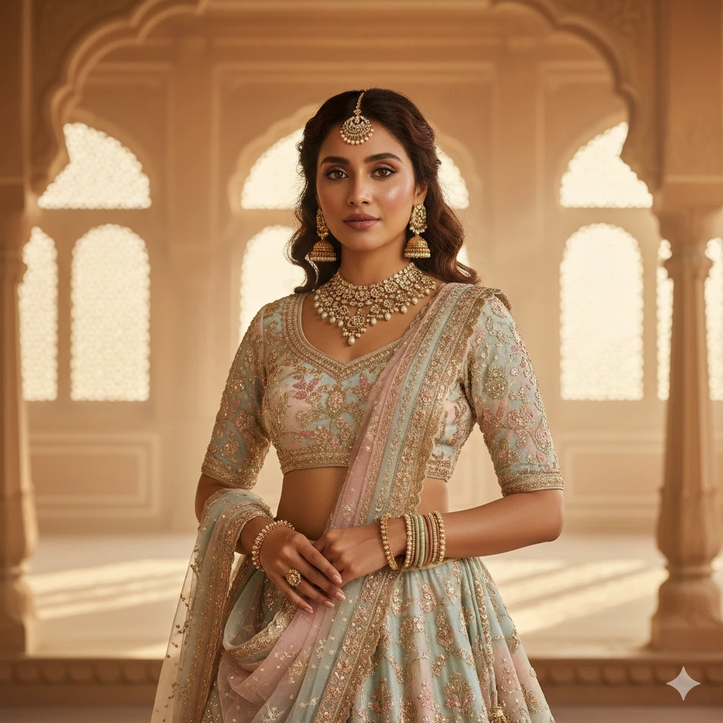 “Indian girl wearing royal pastel lehenga, soft golden palace background, warm sunlight glow, elegant jewelry, smooth brown skin, soft glam makeup, cinematic 8K portrait, dreamy luxe vibe.”
