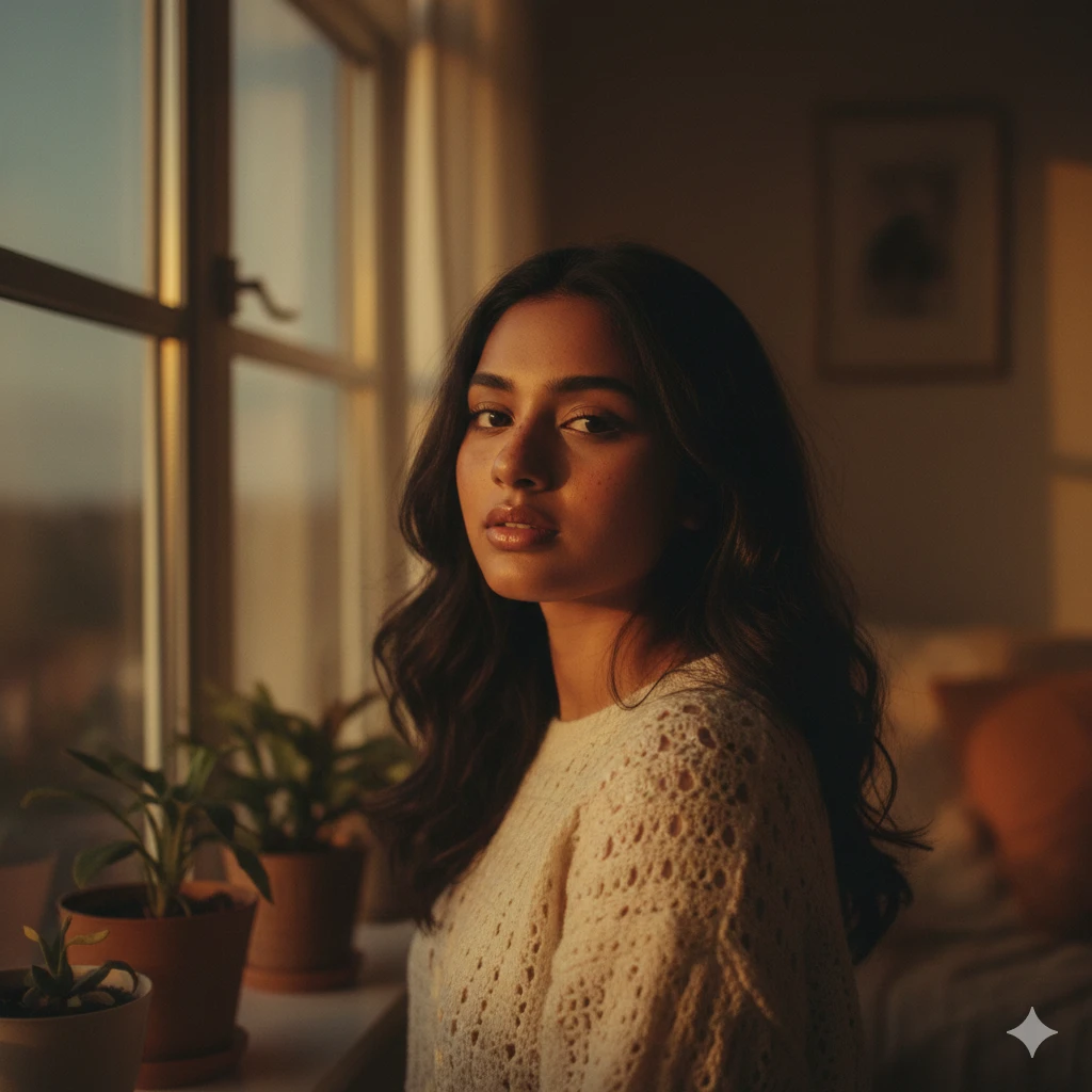 “Indian girl posing near window, warm brown tones, soft sunset lighting on face, natural freckles, glossy lips, vintage aesthetic, dreamy depth of field, HD portrait.”