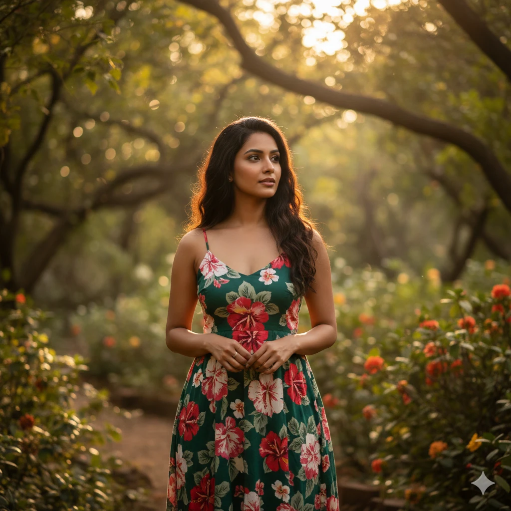 “Beautiful Indian girl in floral dress, lush green garden, soft bokeh trees, natural sunlight on hair, peaceful aesthetic, dreamy 4K portrait.”