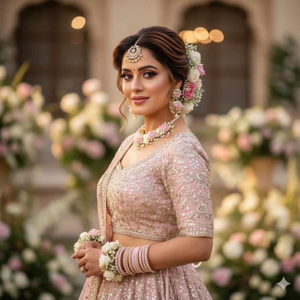 “Beautiful Indian bride in pastel pink lehenga, soft glam makeup, floral jewelry, dreamy background blur, elegant pose, cinematic wedding portrait.”