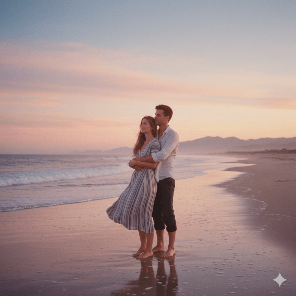 A couple standing on a quiet beach at sunset, pastel retro colors, warm highlights, soft grain, gentle wind motion, cinematic vintage portrait look, calm romantic mood.