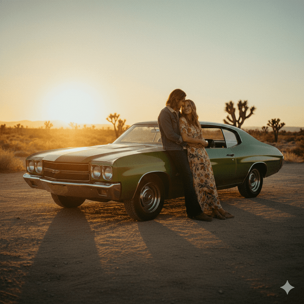 A couple leaning on a vintage car during golden hour, classic 1970s film color grading, deep grain texture, warm shadows, emotional romantic pose, timeless retro cinematic mood.